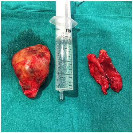 The patient underwent surgery for the exeresis of the tumor. In our case, infragluteal approach was used, pulling away biceps femoris and adductor magnus muscles until the nerve was isolated by plane dissection and neurovascular structures were referenced (Figure 2).