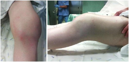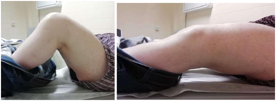 A 46-year-old man presents in our emergency with fever, severe left knee pain with inflammatory signs, within one week of evolution (Figure 1). He had sigmoid colon adenocarcinoma, submitted to left hemicolectomy (February 2013), retroperitoneal metastasectomy (January 2014), and chemotherapy. An intraarticular infiltration with steroids was performed two weeks before on that knee. An initial white blood cell count was slightly elevated at 11.3/mL with elevated C-reactive protein of 160.1 mg/L. A possible septic arthritis was diagnosed and it was performed evacuated arthrocentesis for microbiologic analysis and joint lavage with hematopurulent content output. He started empiric treatment with intravenous flucloxacillin 2g qds and gentamicin 240mg. No significant clinical improvements while awaiting results, underwent knee arthrotomy, joint lavage, extensive debridement and arthrolysis. During the surgery, it was found purulent content and dark pigmentation on bones and soft tissues (Figure 2). Postoperative microbiology samples reveal metecilin-sensible Staphilococcus aureus infection. It was made urine tests of alkaptonuria, that were positive. After maintaining the intravenous flucloxacillin for 2 weeks with good response, the treatment was shifted for oral with rifampicin, according to antibiogram. Besides antibiotic cycle, rehabilitation was also important for the treatment, and the patient improved his endurance with satisfying range of motion of the knee. After four years follow-up, the patient can walk 90 with crutches, with minor knee pain. He also presents complaints on both shoulders. In physical exam he has limitation on range of motion in knees (Figure 3) and shoulders. Radiologic findings show osteoarthrosis joints (Figure 4), but no additional treatments were done or proposed.