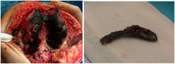 Alkaptonuria is a rare autosomal recessive metabolic disease, with an incidence of 1:125,000 to 1:1 million worldwide. First description of Alkaptonuria was done by Garrod in 1908, that also recognized it to follow classic Mendelian recessive inheritance.1 The genetic defect is mapped to the HGD gene and more than 90 different mutations have been identified to date.2 Alkaptonuria is caused by homogentisic acid oxidase enzyme deficiency, that results in high homogentisic acid levels. It will eventually result in black deposits in skin, sclerae, connective tissues and urine. Ochronosis, dark pigmentation of connective tissues, is the musculoskeletal manifestation of this disease.3 It can lead to early degeneration of cartilage, leading to secondary osteoarthritis,4 by a mechanism that has not been understood.2 A worldwide review conducted in 2004 found that approximately 600 cases of ochronotic arthropathy have been reported since 1962.1 The diagnosis is often delayed because of its low prevalence and non-specific early symptoms.4 The diagnosis occasionally is discovered intraoperatively in patients undergoing joint replacement surgery through the observation of the characteristic bluish-black pigmentation of the tissue surrounding the joint.2 Ochronotic arthropathy manifests first in the spine. Subsequent degeneration is on the knee (most commonly affected, in 64% of cases), hip, and shoulder. Small joints of the hand and foot usually are not affected.2 Homogentisic acid and its oxidation products could accumulate also in the sclera, skin, heart valves, the cartilage of the nose and ears, tendons, ligaments, renal tubule epithelial cells, pancreas, and arteries.5–7 In this paper, it is described a clinical presentation of ochronotic arthropathy with septic arthritis in the knee, of a complex patient.