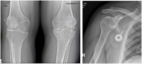Figure 4 Radiologic findings showing osteoarthrosis joints: A. Bilateral Knee anteroposterior x-ray; B. Right Shoulder x-ray.