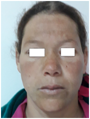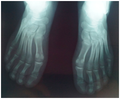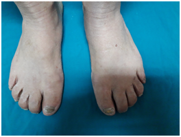 Mrs. EH, 32 years old, with no particular medical history, was hospitalized for exploration of a bilateral Raynaud’s phenomenon of both hands with arthralgia of large and small joints for more than six months. She complained of asthenia of progressive aggravation without other associated signs. The physical examination found a puffy face (Figure 1), cutaneous xerosis and sclerosis, a psychomotor slowing with a rasping voice. Osteoarticular examination showed bilateral and symmetrical edema of the fingers (Figure 2) and toes (Figure 3) with swelling and reducible subluxation of the distal interphalangeal (DIP) joints (Figure 4). The other joints of the hand were simply swollen on examination. The large joints were normal. The rest of the somatic examination was normal. In biology, the blood count showed normochromic normocytic anemia at 10.8g/dl, a normal rate of leukocytes with a normal platelet count. The inflammation parameters were normal with a C-reactive protein at 6mg/l and a sedimentation rate at 10mm H1. Renal function was normal. Antinuclear antibodies, antibodies against cyclic citrullinated peptides (anti-CCPs) and rheumatoid factor were negative. Capillaroscopy showed normal capillary loops. X-rays of the hands (Figure 5) and forefeet (Figure 6) showed subcutaneous soft tissue swelling with joint space narrowing in the proximal interphalangeal without erosive carpitis or geodes. Faced with asthenia and psychomotor slowing, thyroid function tests showed a TSH at 750μunits/ml (N:0.5-7). The diagnosis of severe peripheral hypothyroidism was retained and comforted by biological rhabdomyolysis with creatine phosphokinase (CPK) at 1749 IU/l (N: 38-171) and lactate dehydrogenase (LDH) at 593IU/l (N<248). Cardiac echocardiography showed good segmental and global left ventricular function with circumferential pericardial effusion. Cervical ultrasound revealed a multinodular normal size thyroid gland with TIRADS II nodules. Antithyroglobulin and antiperoxydase antibodies were negative. The patient was treated with L-thyroxine with progressive doses. The evolution was marked by a clear clinical improvement with disappearance of arthralgia, regression of edema and persistence of a slight subluxation of the IPD without local inflammatory signs. Clinical and biological euthyroidism was perfectly obtained at 4 months of follow-up while the patient was under 100μg/day of L-thyroxine.