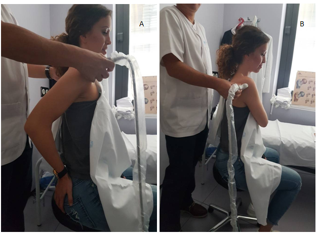 Figure 1 (A) The position of the shoulder may favor the exposition of anatomical structures. Supraspinatus tendon is better exposed on the “Marilyn Monroe pose”, (B) while supraspinatus tendon is better exposed on the “military position”.