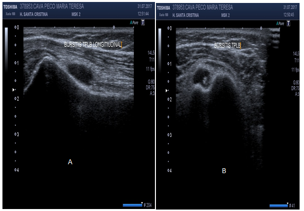 Figure 14 Bursitis of the long head of the biceps in short axis (hyperechoic ring in A) and in long axis (tear sign in B).