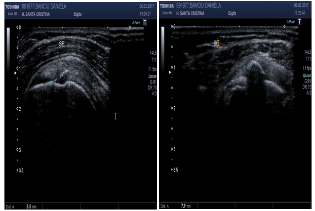US is the preferred technique for the evaluation of painful shoulder. US can diagnose subacromial impingement, rotator cuff pathology, tendonitis, bursitis and partial or full thickness rupture.8 As International Guidelines state, a complete standardized protocol for shoulder evaluation should include at least 9 scan images involving routinely structures such as Acromioclavicular (AC) joint, Long Head of Biceps, Subscapularis, Supraspinatus and Infraspinatus tendons and SASD bursa.17 Additional imaging may include dynamic evaluation of rotator cuff. Contralateral shoulder imaging may be performed immediately to assess normality, if needed.