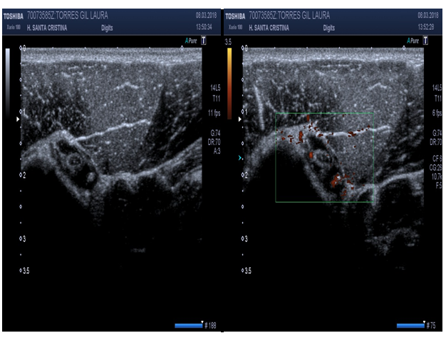Doppler evaluation may help discriminate vascularization on anatomical structures, then synovitis could be confirmed (Figure 19).