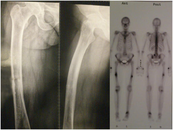 Previous to the accident the patient reported pain in both thighs of 2 months of evolution, more in the right femur, according to the patient's report the pain had been progressive and increasing with the passage of days. She was being treated at another institution where she underwent radiography, magnetic resonance imaging (MRI) and total body scintigraphy (Figure 1). Both radiographs and MRI prior to trauma showed the presence of FFA and the scintigram reported increased bilateral uptake in femur diaphysis.