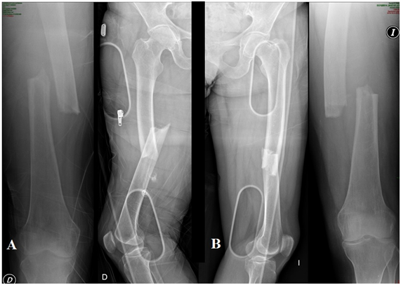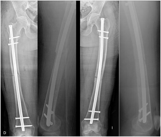 The patient was admitted to the common room and bilateral trans-tibial skeletal traction was performed. The reduction and osteosynthesis was performed on the same day of the accident, the patient was operated on a traction table and the osteosynthesis was performed on both femurs with milled intramedullary nails (Synthes universal nail). Osteosynthesis was performed first of the left femur and then the right one (Figure 3). Immediate partial load was indicated with the use of crutches. The use of alendronate was discontinued, it was indicated to continue with vitamin D and no other medication was added.