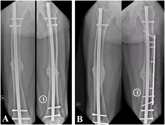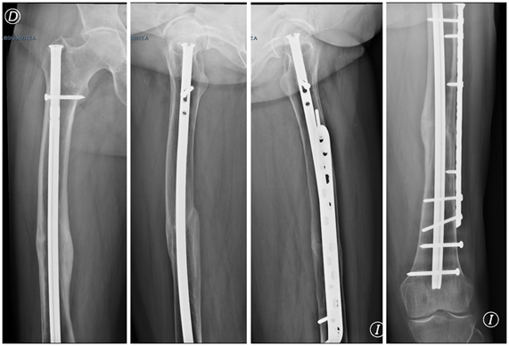 In the left femur we decided to use a plate on the nail already placed because we saw the formation of hypertrophic callus, the consolidation was achieved 3 months after this last surgery.