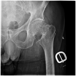 Figure 4 AP view of the left hip showing acceptable reduction and surgical fixation with an intramedullary nail.
