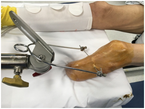 Figure 2 A tibial traction pin is placed through the stump of the patient’s ipsilateral tibia 2.5cm posterior and distal to the tibial tubercle.