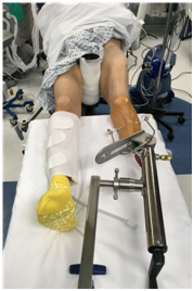 The patient was positioned on the fracture table (OSI Modular Table System) with a perineal post present to stabilize the patient. Initially we attempted to position the patient using the reverse surgical boot method.1,4 but ultimately felt this position compromised the ability to control the reduction and due to the boot size did not enable us to utilize any of the distal locking screws within the nail itself. We proceeded to place a tibial traction pin through the stump of the patient’s ipsilateral tibia at the described insertion site 2.5cm posterior and distal to the tibial tubercle (Figure 2), under sterile conditions prior to operative preparation and draping. We then used the disposable tibial traction arm applied to the pin and hooked the arm onto the base of the traction boot with said boot removed (Figure 3). This technique allowed an assistant to control rotation, traction, and abduction/adduction of the ipsilateral leg into a position for acceptable reduction from the base of the fracture table as if the boot was in use and controlled within the limitations of the table. This setup allowed us to obtain and maintain an acceptable reduction and allowed for intraoperative freedom while inserting the IM device as well as interlock distally without any impedance or difficulty in maintaining or reduction (Figures 4 & 5).