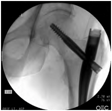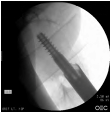 Figure 5 Lateral view of the left hip acceptable reduction and surgical fixation with an intramedullary nail.