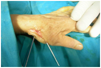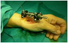 After an open debridement of the first carpometacarpal joint (Figure 2) we apply, under x-ray control, a mini ex-fix system3,5 (Figure 3).