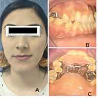 Figure 4 Patient with maxillary constriction, creating a pseudo class III. Undergoing the same procedure. A: frontal photo; B: lateral oral photo; C: oral photo with the hyrax.