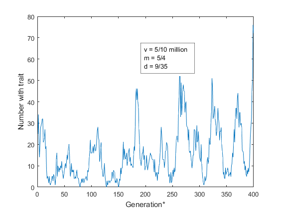 We assume that the population has one million people, that is N = 1,000,000 and mutation rate v = 5 × 10-7, so on average one mutant individual is formed per generation. The proportion 26/35 of affected individuals reproduce, that is d = 9/35, and the rate at which fertile affected individuals reproduce children similarly affected is m = 5/4. Applying equation (2) gives mean A = 14. As we note below, in the long run, the median number affected is 11, which is about one fifth of the prevalence given by Elliott et al.4