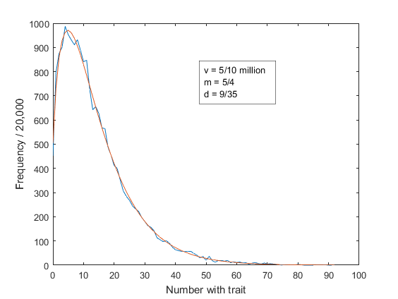 In the simulation reported here, the population started with zero affected members and ran for 20,000 generations. A snapshot was taken of generations 9,801 to 10,200. The numbers affected are displayed in Figure 1. The distribution of number affected per generation over all 20,000 generations is shown in Figure 2. The mean number is 14.12, standard deviation 11.56 and median number 11. This is an indication of the stationary distribution, here fitted by a negative binomial distribution with parameters and .