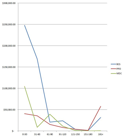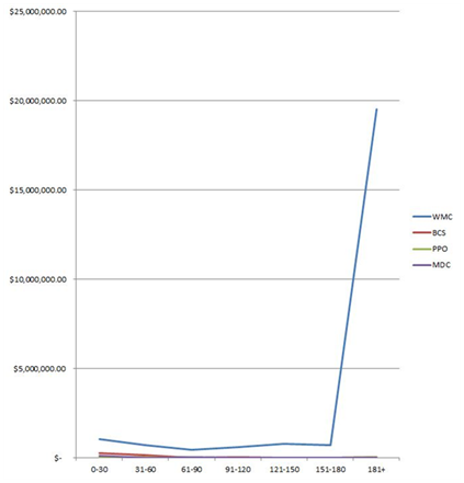 We subsequently graphed the accounts aging or time in collections versus the total accounts receivable (Figure 1). Due to the fact that there was such a disparity between the collection timeline for workers’ compensation and personal injury and the other subgroups, we subsequently graphed the subsets of PPO, BCBS and Medicare separately (Figure 2).