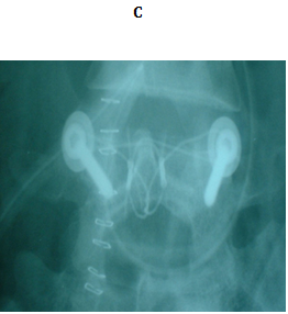 The surgical technique involved placing 4.5 mm fully threaded cortical screws with washers into the pedicles of the affected vertebra for most of their lengths. A 1 mm titanium double ended atlas cable with ball and socket ends was passed underneath the laminae from caudal to cranial then cut (Figure 1). Each end was passed around the head of the contralateral screw and wrapped around the spinous process cranially then passed through the ball and socket end. The cables were simultaneously tensioned and crimped. The soft tissues in the pars defect was thoroughly debrided then burred to square it off for fitting a tricortical iliac bone graft which was compressed across the defect while tensioning the cables (Figure 2).