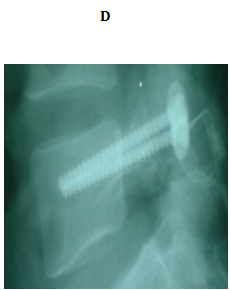 Figure 3 18 years old male with bilateral pars defect at L5 underwent the procedure. (A) Preoperative lateral plain radiograph showing the defect (B) Preoperative MRI shows intact intervening disc (C, D) Immediately postoperative plain radiographs (E) CT 1 month later. Note the bone graft incorporating at the defect site.