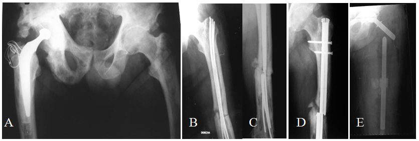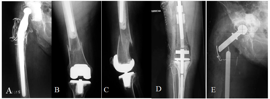Figure 1 A- 82 year old patient with a well functioning right Charnley hip arthroplasty after 6 years, Paget´s disease in both femurs and right hemipelvis, presents a left femur fracture. B- Osteosynthesis with Ender nails. C- Nails fail in 17 months. New osteosynthesis with locked nail. D- Failure in 8 months. E. TFR.