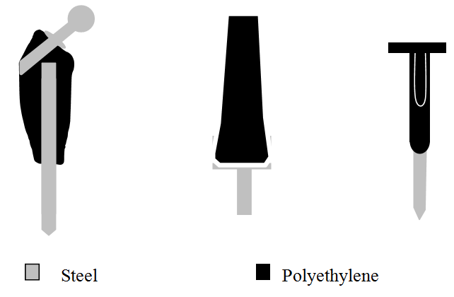 The high density polyethylene body has essential characteristics for the appropriate functioning of the prosthesis, such as absorbing physiological loads in order to avoid fatigue failures, filling dead space after the resection, preventing the formation of hematomas and providing anchorage for tendons and muscles by means of several holes in its surface.4-6 The metallic part of the implant is made of medical grade stainless steel AISI F 138.4-6