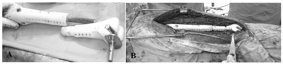 Figure 4 A- dissassembled total femoral megaprosthesis. B- Total femoral megaprosthesis assembled and in place.