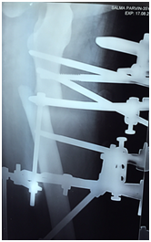 A 26 year lady, a known case of ADO 2, was referred to our center following a fall at home one month earlier. Her district hospital team had suggested a trial of conservative treatment, but due to the persistent pain and discomfort of immobilization she requested for surgical intervention. Despite sustaining the injury a month earlier, she was still suffering from substantial pain. Radiographs showed a subtrochanteric fracture of the left femur- Seinsheimer 2A without healing callus. After ruling out other injuries, skin traction was applied. The treatment options and all possible complications- intra, immediate and delayed post-operative were explained to her and the family. A collective decision was made to apply an ICD as we aimed to minimize operative time, reduce possible damage to tissue and bone, and limit surgical scarring. The necessary pre-operative investigations were done, and optimized where needed.