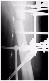 The fracture united at 22 weeks, which is within the range documented in literature.4,5 A major contributing factor to the healing is the ICD‘tension-stress’ principle, which coupled with the micro-motion at bone-wire interface stimulates osteogenesis, angiogenesis and desmogenesis.8 An important component to the system is the specially designed Russian 1.8millimeter bio-compatible bayonet olive-wires we used. The sharp ‘cutting-tips’ of these wires permit a faster, and hence a more efficient bone penetration. This in-turn, optimizes operative time by preventing equipment failure, and most importantly minimizes periosteum and tissue damage- aiding to faster healing and union (Figure 7).