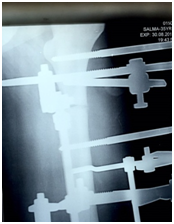 The total surgical time was about 50 minutes. There was negligible blood loss as only stab incisions were made for the schanz pins entry. Post- operative pain was well managed with just opioids for a fixed duration of three days, and on a ‘prn’ basis subsequently. She was advised partial-weight bearing mobilization the day after surgery, and over the course of the translation period. The translation process was ceased after five days when radiographs showed good bony contact and alignment in both coronal and sagittal planes. Thereafter she was encouraged for full-weight bearing with a use of aid when required (Figure 3).