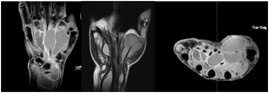 Simple X-rays revealed no abnormal findings in bone, joint, and soft tissue. Magnetic resonance imaging (MRI) (Figure 1) was suggestive of flexor tendon sheath tenosynovitis. It revealed a fluid collection in the tendons sheath of the first to fourth fingers and in the flexor compartment along the ulnar and radial side of the wrist.