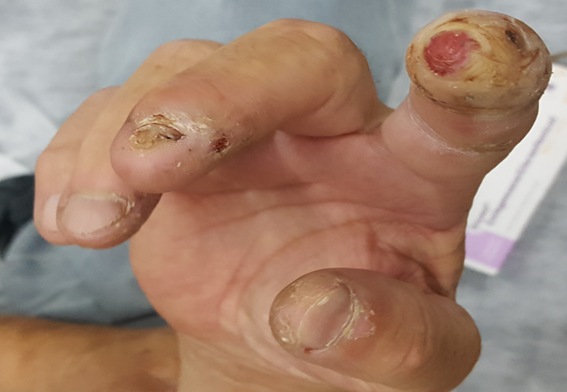 Figure 2 Ulcers in the granular stage of minimally exudative healing in distal regions of the phalanges of fingers 1 to 4 of the right hand. With total loss of the nail plate of the 2nd finger and partially of the 3rd finger.