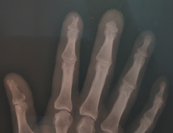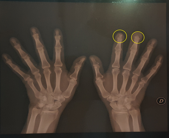 Figure 3 X-ray of the right hand where the acroosteolysis of the 2nd and third fingers is observed more closely.