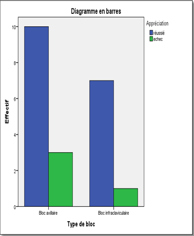 Over the 21 patients, 13 received USAB and 8 were under USICB. Neurostimulating was needed with 4 patients. Success rate of the USAB was 87% and 77% for the USICB. (p value: 0.6350). The distribution of the patients depending of the level of the surgery; the hand (57%) forearm (28.5 %) and arm (14.5%). The median time of proceeding was 20 min for USAB against 24 min for USICB (p value 0.2755). The injection resistance has been encountered only once even in the USAB and the USICB, (p value 1). Paresthesia and pain during block process were seen 6 and 7 times in the USAB while the score was 3 and 5 times for the USICB (p value 1) (Figure 3 & Table 1).