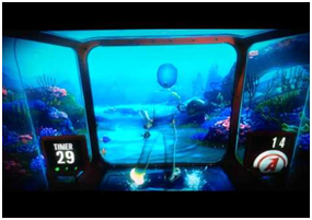 Virtual reality balance training was given to the patient using Xbox 360 with kinect. Xbox 360 Kinect is a camera system that is controller free camera system that use infrared technology. Kinect detects wave of the hand and body movements. The software tracks 48 body points. Camera tilts upward and downward and detects body movements and follows user around the range of the camera.5 20,000 leaks game was used to train patient. In this game the player’s avatar is in a glass cube under water. Fish, crabs, sharks & other sea creatures cause cracks and holes in the cube. Player uses limbs, hands, feet and head to plug the holes. Each game consists of three waves. The name is a reference to the novel "20,000 Leagues under the Sea" by Jules Verne (Figure 1).