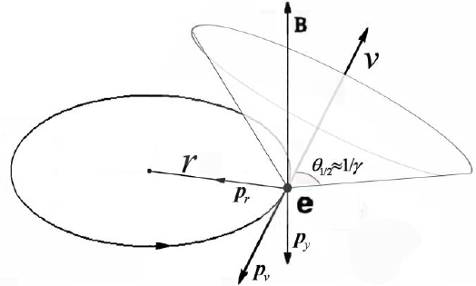So, the light cone of the photon radiations was centered on the tangent of the cyclotron orbit, and along the direction of the single electron's moving speed