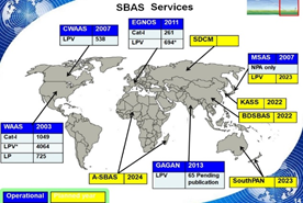 Figure 14 Operational and planned world SBAS coverage (African SBAS not operational except trial facilitated by Nigerian Satellite; NIGCOMSAT-1R).