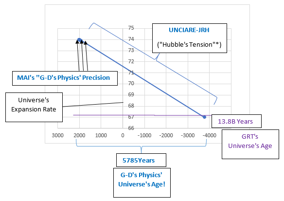 Indeed, according to Kuhn's22,23 analysis, in order for this NSP G-D'S Physics to be accepted by the (general) Scientific (Physicists & Astronomers/Cosmologists) Community – i.e., as more valid than the Old MCR Paradigm (of GRT & QM), it is necessary for this G-D'S Physics NSP to identify- and empirically validate- at least one (unique) "Critical Prediction", (e.g., such as the abovementioned UNCIARE-JRH prediction), as being more accurate than the corresponding prediction of GRT (or QM)!; As will be delineated (below), this (unique) G-D's Physics UNCIARE-JRH "Critical Prediction" points an MAI (annual) increase in the universe's expansion rate, whereas the Old MCR's GRT's corresponding prediction may only point at a "constant" rate of the universe's expansion! Interestingly, this principle difference between G-D's Physics UNCIARE-JRH MAI (cumulative) increase in the universe's expansion rate and the Old MCR's GRT's "constant rate" of the universe's expansion – may also challenge the Old MCR's GRT's "Big-Bang" assumption regarding the universe's age, as well as offer a satisfactory (new) explanation for the (otherwise "unexplained") "Hubble's Tension" Enigma: i.e., indicating the existence of a significantly observed increase in the universe's expansion rate from its early Cosmological value to the current (increased) Astronomical value of the universe's expansion! This is simply because if the universe's expansion rate increases (annually) based on the JRH's CHCF (two days special time-interval), then we should expect an increase in the universe's expansion – e.g., from its initial Cosmological measure to the current (MAI's cumulative increased) Astronomical measure, e.g., thereby explicating the "Hubble's Tension" Enigma!24