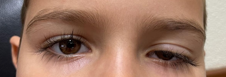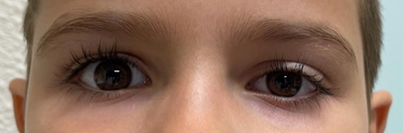 The child was observed 3 days later with a worsening of the palpebral ptosis and the mother also reported complaints of diplopia (the boy stated “seeing two mothers”). No other symptoms developed and there were no new episodes of vomiting. At this time, he already had an occlusion of the visual axis (Figure 2). Also, an anisocoria of 0.9 mm was observed with a bigger right pupil diameter in the dark (right eye 5.3 mm vs left eye 4.4 mm). Visual acuity was still preserved with 20/20 on both eyes and color testing was normal. No diplopia was observed (he could only see 4 images on the Worth 4 dot test) and ocular alignment and movements were still also normal.