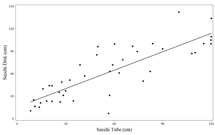 This equation was based on regression of paired Secchi depth and Secchi tube readings (R2=0.694, p < 0.01; n=42) (Figure 2). Trophic State Index (TSI) was calculated using the following formula:25