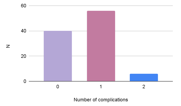 The distribution by number of complications showed that 40% of the patients had no events, 56% had a single complication and 6% had two events. The average number of complications per patient was 0.7 ± 0.9 (Table 3) (Figure 1).