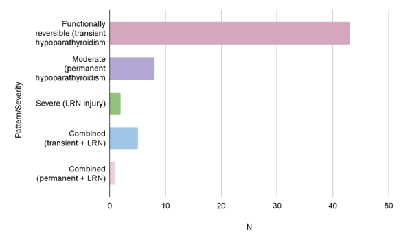 Analysis by pattern and severity showed a predominance of reversible functional events (71.7% of patients with complications), while moderate (permanent hypoparathyroidism) and severe (NLR lesion) events were rare. Combined complications represent 10% of cases (Table 4) (Figure 2).