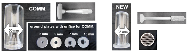 Figure 3 Commercially (COMM.) available forward extrusion Rig HDP/FE (left) vs. the new constructed one, with has a smaller diameter as well as another ground plate .