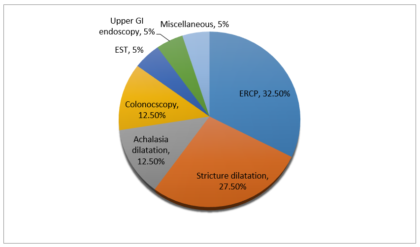 The overall breakup of perforations according to etiology showed maximum number of perforations with ERCP, followed closely by stricture dilatation, as depicted in Figure 1.