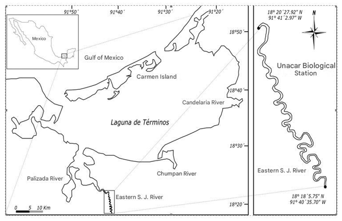 Study area. The San José del Este river is located southeast of the municipality of Carmen in the state of Campeche, its extension is approximately five kilometers, it is a tributary of the Palizada river that flows into the Laguna de Términos. The study area is located between the coordinates 18°20'27.92 "N, 91°41'2.97 "W and 18°18'5.75 "N 91°40'35.70 "W (Figure 2).