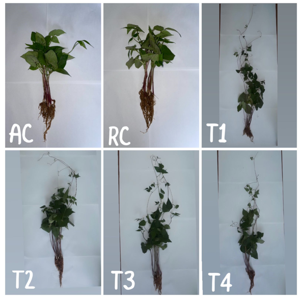 Figure 3 shows the positive response of P. vulgaris to M. symbioticum in the number and green color of the leaves, since M. symbioticum colonizes the radical system which transformed organic compounds released by plant metabolism into phytohormones21,22 to increase the height of P. vulgaris. With an increase in the size of the plant as well as the greater number of dark green leaves indicative of the maximum synthesis of chlorophyll. In addition, through an action of phytohormones of M. symbioticum 3 accelerated the flowering stage and the density of the roots.28-31 In the same way, a positive effect on the healthy growth of P. vulgaris was observed by isolates 1, 2 and in combination with number 3; with 50% NH4NO3 with improved growth of the leaf and root system,32,33 despite the fact that P. vulgaris seeds were inoculated with M. symbioticum instead of the foliar route - the most common application in plants. Meanwhile, at the level of the root system of P. vulgaris, with M. symbioticum, the maximum uptake of 50% NH4NO3 was registered, generating a vigorous and healthy plant. This is due to the profile of phytohormones that M. symbioticum can transform within the root and leaf tissues that communicate through the vascular conduction system.16,35 As shown in Figure 3, compared with the number, color, and size of the leaves, the density of the root system of P. vulgaris not inoculated with 100% NH₄NO₃. It was evident that the uptake of 100% NH₄NO₃ was not the maximum, compared to the growth registered in P. vulgaris with M. symbioticum and 50% NH₄NO₃. This demonstrates the versatility of M. symbioticum as an endophyte of P. vulgaris, from leaves to roots and vice versa, without any problem.36 Based on the type of metabolism of M. sybioticum, it is possible to optimize the reduced dose of NH₄NO₃ to prevent the remaining NO3- from being transformed into N2O by soil microorganisms, and at the same time, M. symbioticum oxidizes CH₄ in the soil generated by microbial anaerobic activity a positive compensatory effect on mitigating global warming caused by intensive agriculture with unregulated doses of chemical fertilizers and other chemicals.36-39