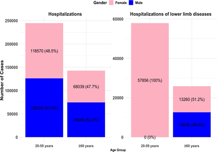 Figure 5 demonstrates a distinct gender disparity in hospitalizations and mortality due to lower limb circulatory diseases. Females aged 20 to 59 years had the highest hospitalization rates, yet exhibited the lowest mortality rates, suggesting better clinical outcomes despite a higher disease burden. Conversely, male patients in the same age group had fewer hospitalizations but a greater number of deaths, indicating a more severe disease progression or delays in seeking medical care. A similar trend was observed in the over 60-year-old group, where males had slightly lower hospitalization rates but experienced higher mortality compared to females. These findings highlight the need for targeted preventive strategies, particularly for male patients, to reduce the risk of severe complications and fatal outcomes associated with circulatory diseases affecting the lower limbs.