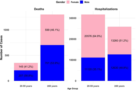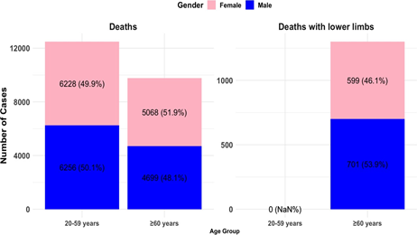 Death records for hospitalized patients demonstrated a predominance of male and female patients over 60 years of age, reinforcing the greater burden of circulatory diseases in older populations (Figure 4). In younger age groups, females exhibited a higher prevalence of hospitalizations due to lower limb diseases but a lower death rate, whereas male patients had a lower hospitalization rate but a higher mortality rate. This trend was consistent across both age groups, as shown in Figure 5.