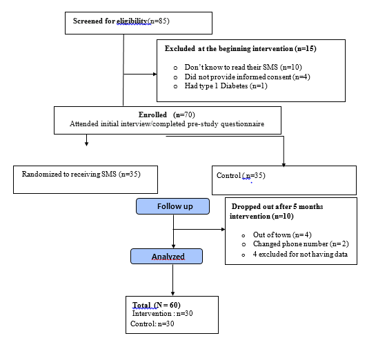 Eighty five patients were assessed for eligibility during the recruitment (febuary 2022–June 2022) Fifteen were excluded at the beginning intervention as 10 did not know how to read their SMS,20,21 four patients did not provided informed consent and one had type 1 diabetes. Through the end of the baseline study, we excluded more patients for changing their phone number and/or missing data and observed a series of dropouts that caused the loss of 10 patients (Figure 1,2).