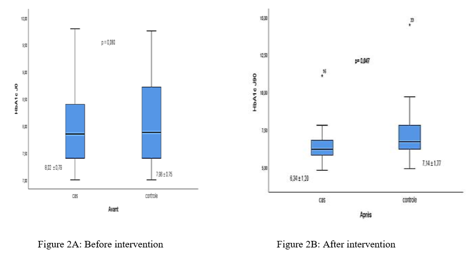 It is with this in mind that some studies have been conducted to assess the impact of educational text messages on the metabolic balance of diabetics. For example, a study carried out in Iraq in 2014 to assess the feasibility and usefulness of short message services demonstrated a decrease in HbA1c of 0.7% compared to baseline.10 Moreover, in 2017, a randomized clinical trial in Egypt to examine the feasibility as well as the impact of educational text messages demonstrated that there was a decrease in HbA1c of 1.05% as well as a considerable improvement, treatment compliance, self-efficacy and knowledge scores in favor of the intervention group.4 Therefore, the use of mobile phones to provide self-management support, however, enables patient-centered care at the frequency and intensity desired by patients outside of the clinic environment.3 This would thus contribute to reducing the risk of contamination during this period of the COVID 19 pandemic. It is with this in mind that we have proposed in this study to evaluate the effect of educational text messages on the metabolic balance of diabetics followed at the National Center for Diabetology and Hypertension in Yaoundé and at the General Hospital in Yaoundé. Therapeutic education by SMS improves the metabolic balance of diabetic patients.