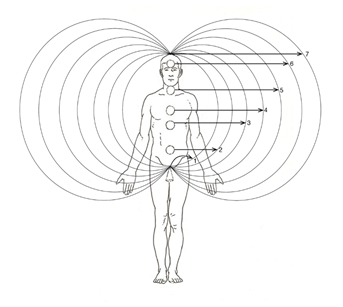 Figure 1 The seven energy levels of the man’s body NEMF and the seven alternating vortices (spinning clockwise) and anti-vortices (spinning counterclockwise) of this NEMF along the backbone.